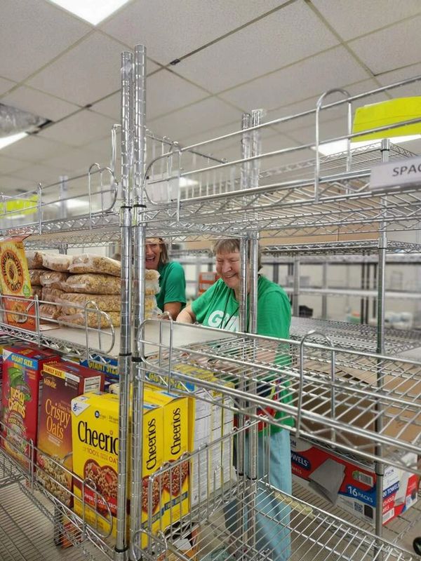 Volunteer explaining the shop through system to church Liaison (Vickie Shkane at Gahanna Community Congregation)